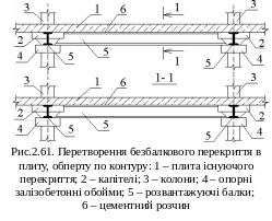 У першому випадку існуюча плита (варіант підсилення використовується при значному руйнуванні безбалкового перекриття) замінюється на нову (рис. 2.59). Якщо ступінь пошкодження існуючого перекриття дозволяє зберегти та використовувати його в подальшому, по верху плити влаштовується монолітна залізобетонна сорочка. Ця конструкція може працювати незалежно від існуючої плити (коли неможливо створити надійне зчеплення нового і старого бетону) або сумісно. В цьому випадку для поліпшення зчеплення в існуючій плиті влаштовують поглиблення діаметром 100 мм із кроком в обох напрямках 500...700 мм, які відіграють роль шпонок (рис. 2.60). У поглиблення встановлюються петлі з арматурної сталі, що заводяться під арматуру існуючої плити та прив’язуються до арматури набетонки. Товщина залізобетонної сорочки визначається розрахунком, але не може бути менше ніж 50 мм.