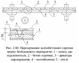 Плити можуть підсилюватися також нарощуванням знизу існуючої конструкції. При цьому до арматури плити приварюється додаткова арматура сорочки, а потім наноситься шар торкретбетону (рис. 2.58).