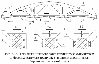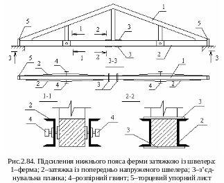 Попереднє напруження такої жорсткої арматури створюється також шляхом відгинання профілю від прямолінійного напряму, але вже в горизонтальній площині. При підсиленні нижнього пояса поздовжня додаткова арматура кріпиться або до торцевого листа (рис. 2.82), якщо є можливість розмістити його між сусідніми фермами чи фермою і стіною, або приварюється до „коробочки“ із листового металу, якою обшивається опорний вузол.