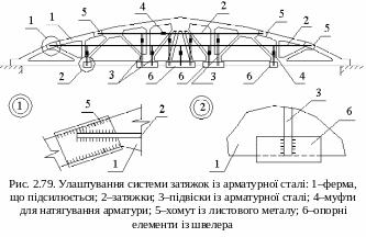 При встановленні системи затяжок із арматури (рис. 2.79) або шарнірно-стрижневого ланцюга (рис. 2.80) зусилля в елементах ферм зменшується, оскільки значну частину їх удається передати на елементи підсилення. Перерізи конструкції підсилення розраховуються та включаються в роботу шляхом їх попереднього напруження. Під час використання системи затяжок виникає проблема рівномірного і симетричного включення в роботу всіх затяжок, тому що при нерівномірних напруженнях у затяжках може мати місце не розвантаження, а навпаки — довантаження окремих елементів ферми та їх руйнування.