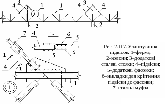 Косець підсилюємо нарощуванням поперечного перерізу штабою зі сталі завтовшки 6 мм, привареною до полиць кутика (рис. 2.118, в). Ширину штаби підбираємо так, щоб центри мас перерізу до і після підсилення практично збігалися, виключаючи позацентровий стиск кісця.