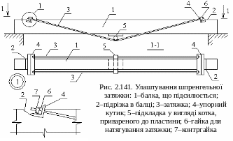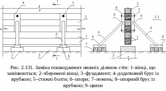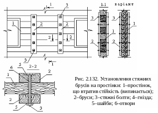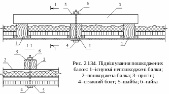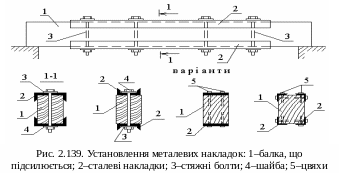 Підсилення ушкодженої частини виконують після її вивішування на стояку (рис. 2.144) та видалення цієї ділянки на довжині 40 см шляхом прибивання цвяхами (l = 150 мм і d = 5 мм) до бокових поверхонь балки двох дерев’яних пластин (із сосни або іншої породи деревини, але міцністю не нижче ніж осика) перерізом b×h =60×240 мм (рис. 2.144).
