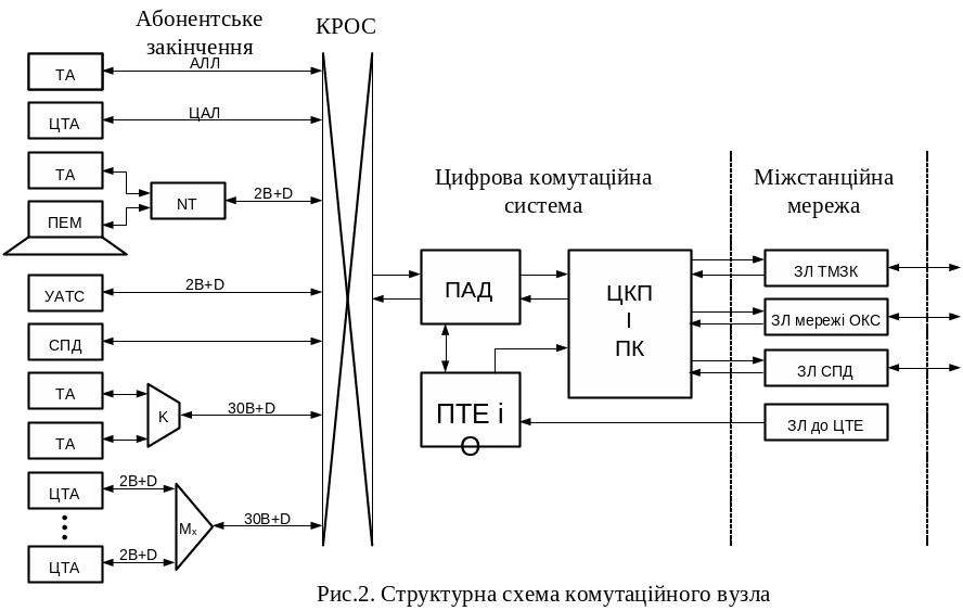 В даний час у мережах зв'язку України експлуатуються безліч цифрових систем комутації (ЦСК). Незважаючи на безліч стандартів і рекомендацій, які покликані забезпечити високу якість зв'язку незалежно від того, ким зроблене чи розроблене устаткування цифрових систем комутації, існує чимало проблем при з'єднанні даних ЦСК у складі єдиної телефонної мережі зв'язку. Однак усі ЦСК, які використовуються в мережах зв'язку України мають практично однакову структуру побудови, що природно є наслідком однакових задач і вимог. Структурна схема комутаційного вузла приведена на рис. 1.19. Як видно зі структурної схеми комутаційний вузол складається з абонентського закінчення, цифрової комутаційної системи та міжстанційної мережі.