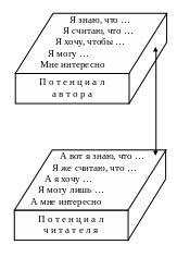 Наличие внимания во время чтения означает наличие разницы между ПОТЕНЦИАЛОМ ЧИТАТЕЛЯ И ПОТЕНЦИАЛОМ АВТОРА ТЕКСТА (уровнем знаний автора, его позицией, его интересами). Эта разница должна быть не слишком большой, чтобы читатель не махнул на него рукой, как на никогда не достижимый уровень. Желательно, чтобы разница между уровнем знаний автора и уровнем знаний читателя, между их целями не была слишком маленькой, чтобы читатель все же почувствовал эту разницу, а значит и интерес к потенциалу автора.