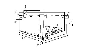 4 – трубопровод для подвода сточных вод на осветление; 5 – иловый приямок; 6 – ферма со скребками; 7 – трубопровод для отвода сырого осадка; 8 – канал отвода осветлённой воды