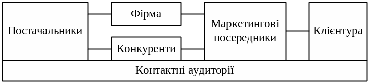 До складу маркетингового середовища входять і різні контактні аудиторії фірми. Ми визначаємо контактну аудиторію в такий спосіб: