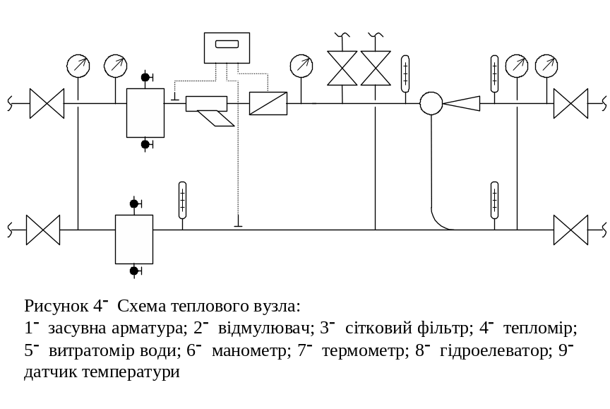 Тепловий вузол застосовують для передачі теплоносія і теплової енергії від теплової мережі до системи опалення. Крім того, тепловий вузол виконує цілий ряд функцій: очищення теплоносія, облік теплоносія і кількості теплоти, зниження температури теплоносія до необхідної для роботи системи опалення, визначення параметрів теплоносія, розподіл теплоносія між різними системами опалення, підігрів води на потреби системи гарячого водопостачання, регулювання витрат теплоти тощо. Залежно від виконуваних функцій підбирається обладнання теплового вузла. Типова схема теплового вузла зображена на рисунку 4.