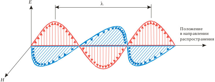 Рис. 4. 2. Электромагнитные волны, состоящие из электрической Е и магнитной Н составляющих