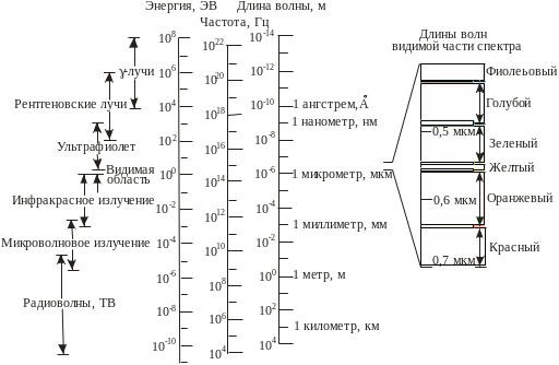 К электромагнитному излучению относятся радиоволны (начиная со сверхдлинных), инфракрасное излучение, видимый свет, ультрафиолетовое, рентгеновское и жесткое (гамма-излучение (рис. 4. 3).