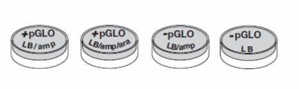 Посмотрите на ваши четыре чашки. Вы видите рост бактерий на чашках LB, не содержащих ампициллин и арабинозу?