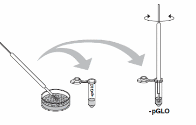 Р ассмотрите раствор плазмиды pGLO под ультрафиолетом. Запишите ваши наблюдения. Окуните новую стерильную петлю в раствор плазмиды. Выньте петлю. На кольце должна быть натянута пленка плазмиды (как пленка мыльного раствора на кольце, когда вы выдуваете пузыри). Помешайте петлей суспензию клеток в пробирке «+pGLO». (если у вас есть микропипетка, добавьте 10 мкл раствора плазмиды микропипеткой и перемешайте). Закройте пробирку и верните ее обратно на лед. Не добавляйте ДНК в пробирку «-pGLO».- это контроль.
