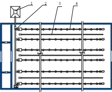 Рис. 3.25 План размещения технологического оборудования для выращивания бройлеров /здание 18×96 м 1 – бункер для хранения корма БСК-Ф-10А; 2 – транспортер для загрузки корма ТУУ-2 или ТЗК-1; 3 – линия поения ниппельная ЛПН; 4 – раздатчик корма спиральный РКС; 5 – линия освещения; 6 – теплогенератор газовый ГП-70; 7 – вытяжной вентилятор большой производительности, регулируемый по частоте оборотов (7 шт.); 8 – окно для приточного воздуха с заслонками для регулирования его подачи (по 26 шт. с каждой стороны).