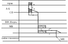 На суточном поле графика горизонтальными линиями наносятся сверху перегоны для графика прибытия, а снизу – для графика отправления поездов. После графика прибытия поездов выделяется «поле» в последовательности для путей: