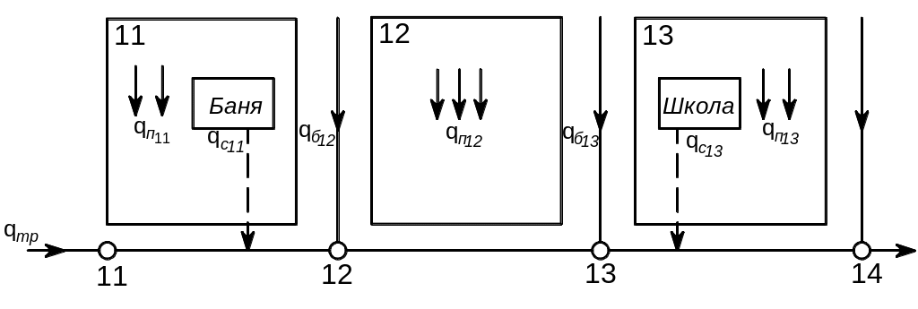 На участке 11-12 расчетный расход складывается из попутного qп11, транзитного qmp и сосредоточенного qс11. На участке 12-13 – из попутного qп12, бокового qб12 и транзитного расхода с участка 11-12. На участке 13-14 – из попутного qп13, бокового qб13, сосредоточенного qс13 и транзитного с участка 12-13.