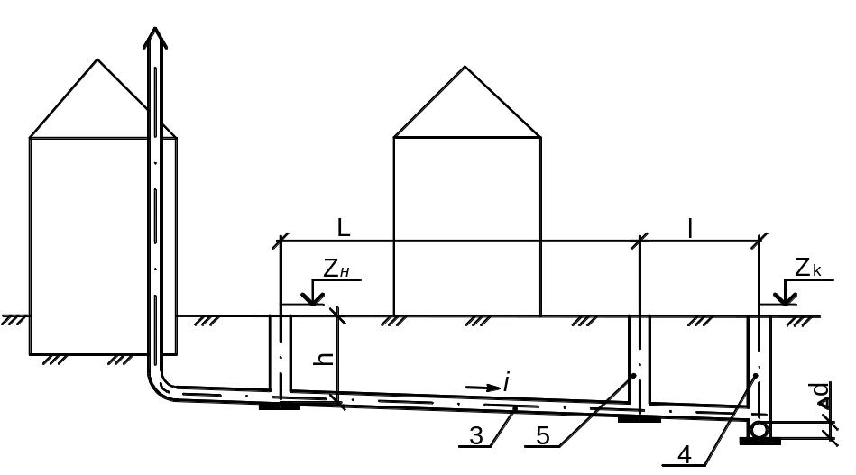 Рисунок 2.3 Схемы к определению начальной минимальной глубины заложения уличного трубопровода: а - план участка; б - продольный профиль по трубопроводу; 1 - квартал; 2 - трубопровод уличной сети; 3 - трубопровод внутриквартальной сети; 4 - канализационный колодец уличной сети; 5 - контрольный колодец.
