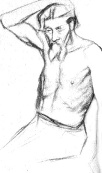 Наконец, Репин переходит к рисунку драпировки. Вначале он драпирует фигуру Натурщика с большим количеством разнообразных по форме складок — ниспадающих, собранных в пучки и спокойно облегающих тело. Однако такое расположение складок вносит в композицию беспокойство и взволнованность, поэтому художник отказывается от такой трактовки и в конечном итоге находит иное решение.