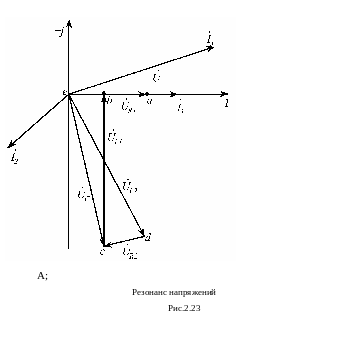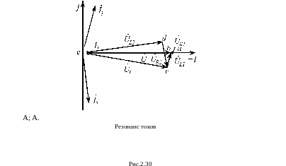Чтобы ответить на вопрос о типе того или иного резонанса, необходимо дополнительно провести расчет режимов схемы при полученных резонансных частотах. На рис.2.22 и 2.23 представлены результаты расчета токов и векторные диаграммы, построенные в одном масштабе для схемы рис.2.21 при входном напряжении U = 2 В на частотах ω01 = 380 рад/с и ω02 = 566 рад/с.