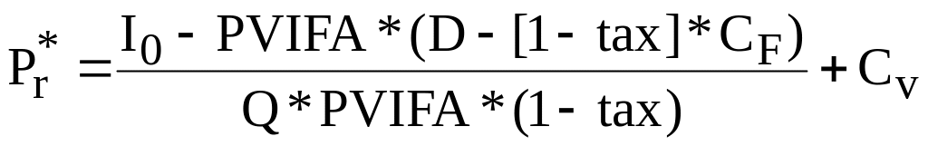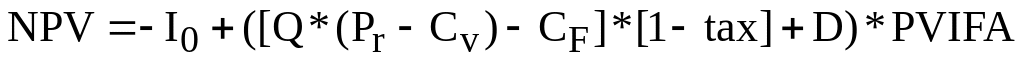 где I0 – инвестиционные затраты тыс.руб.; Q – годовой объем продукции, т.; Cv – переменные затраты на единицу продукции, тыс.руб.; CF – годовые постоянные затраты, тыс.руб.; PVIFA – фактор текущей стоимости аннуитета, коэф.; tax– ставка налога на прибыль, коэф.; D – годовые амортизационные затраты, тыс.руб.