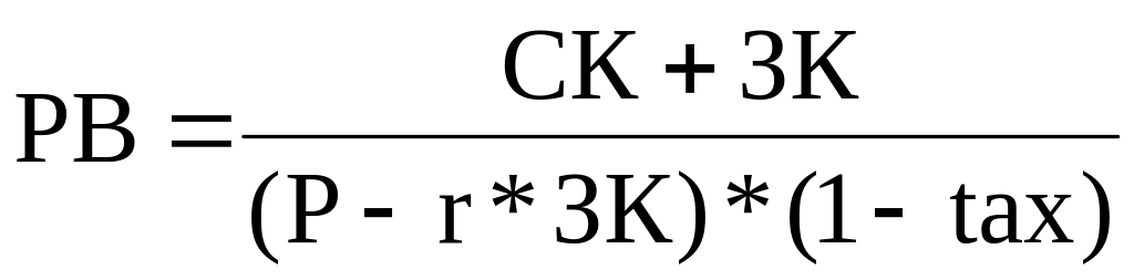 где Р – годовая величина проектной прибыли, тыс. руб.; СК – величина собственного капитала, тыс. руб.; ЗК – величина заемного капитала, тыс. руб.; r – дисконтная ставка инвестиционного проекта, коэф.; tax– ставка налога на прибыль, коэф.