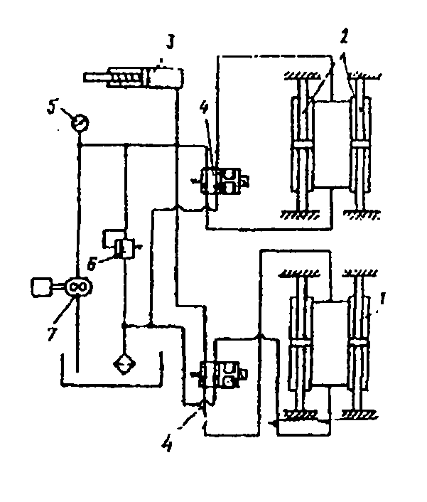 1,2 — левые и правые цилиндры муфты переключения; 3 — цилиндры тормоза привода хода; 4 — золотник с электромагнитом; 5 — манометр; б — редукционный клапан; 7— шестеренный насос.