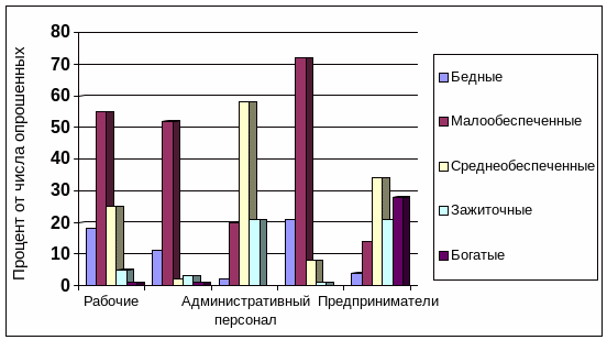 Даже с учетом несомненных достижений периода реформации в России: свобода предпринимательства, слова, союзов, вероисповедания, перемещения; многопартийность, альтернативные выборы должностных лиц и т.д., наличие 40% населения, вынужденного экономить на еде, чтобы покупать одежду и обувь (Россия все-таки в основном северная страна), или же ходить в рваной одежде и обуви, чтобы нормально питаться, это совсем не то, что было обещано. Но самое ненормальное с точки зрения большинства людей то, что уровень жизни административно-управленческого персонала и предпринимателей, несмотря на общую неблагоприятную для страны ситуацию, резко отличается от их собственного. Данные опроса населения, проведенного С.-Петербургским экономико-математическим институтом и Центром стратегического анализа общественных процессов в июле 1995 г., дают некоторое представление об этих различиях (рис. 13).