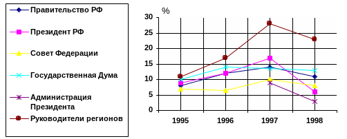 Анализ этих данных показывает, что уровень доверия населения к основным группам российской политической элиты во второй половине 90-х годов XX в. был различным. Наибольшим доверием пользовались руководители регионов. Доверие Правительству, Совету Федерации, Государственной Думе было намного ниже, но практически не менялось в течение всего периода. Доверие Президенту росло до 1997 г., а в 1998 г. резко снизилось (как и доверие руководителям регионов). Эти данные свидетельствуют о нарастании кризиса власти, который в декабре 1999 г. вынудил Б.Н. Ельцина добровольно уйти в отставку.