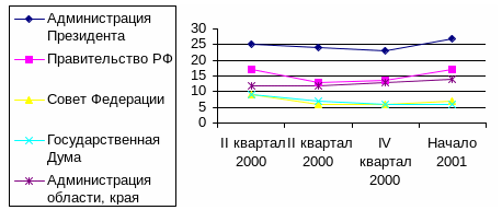 С учетом различия инструментария этих опросов можно утверждать, что в 2000 г. в сравнении с предшествующим периодом возрос уровень доверия населения группам политической элиты, действующим в сфере федеральной исполнительной власти. Уровень доверия группам элиты, представленным в региональных органах исполнительной власти, несколько снизился, а уровень доверительной власти, практически не изменился. Эти данные можно рассматривать как свидетельство приостановки того процесса делегимитации власти политической элиты России, который наблюдался в течение второй половины 90-х годов ХХ в.3 Более того, в начале 2001 г. четко обозначился определенный рост доверия населения практически ко всем группировкам российской правящей элиты в сравнении с последним кварталом 2001 г. (см. рис. 24).