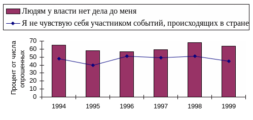 В России пока не сформировалось устойчивое отношение как к политической системе в целом, так и к отдельным политическим институтам, лидерам и взглядам. В течение 90-х годов XX в. у большинства граждан сохранялось ощущение равнодушия властей к их нуждам и невозможности своего воздействия на то, что происходит в стране. Этот вывод можно сделать на основе данных Всероссийского мониторинга ИСПИ РАН (рис. 34).