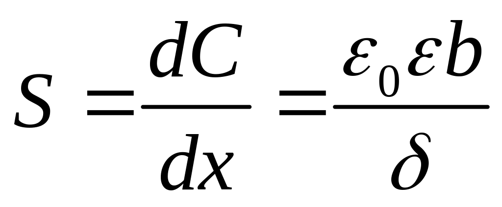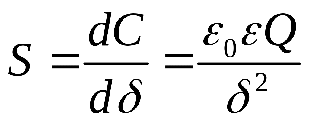сильніше залежить від відстані між пластинами δ, ніж у попередньому випадку. Для збільшення чутливості S доцільно зменшити δ. Граничне його значення визначається технологічними міркуваннями і прикладеною напругою. Треба враховувати, що при малих δ можливий електричний пробій між електродами.