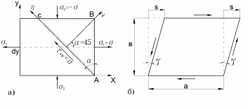 б – элемент материала ограниченный площадками сдвига и напряжения на нём,