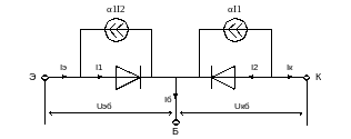 При определении аналитических соотношений между токами и напряжениями идеализированный БТ представляют эквивалентной схемой Эберса-Молла, рис.2. Одномерная модель транзистора состоит из двух встречно включенных идеальных р-n-переходов. Объемные сопротивления слоев, емкости р-n-переходов и эффект модуляции ширины базы не учитываются.