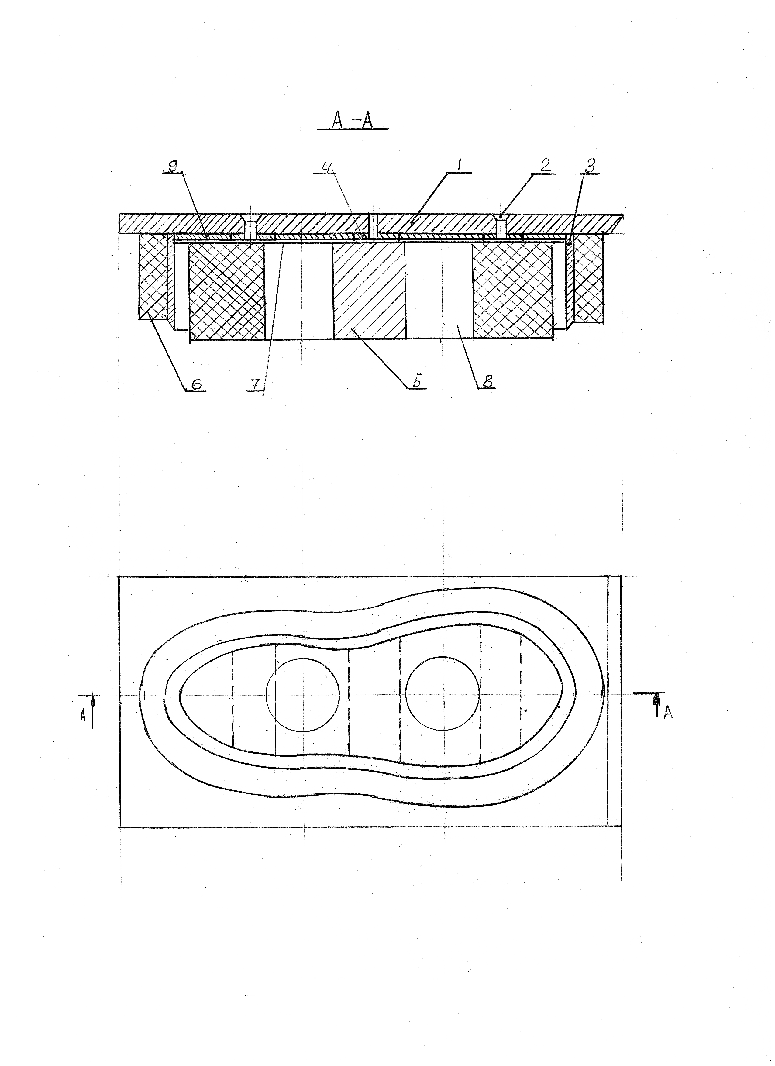 Изготовленный таким образом резак крепится к установочной плите винтами 2. С целью удаления вырубленных деталей из полости резака и предотвращения подъема листа при движении резака вверх (за счет сил трения наружной стенки резака о материал) режущий инструмент снабжается внутренним 5 и наружным 6 выталкивателями, выполненными из пористой резины. Для придания эластичности во внутреннем выталкивателе вырубаются отверстия 8. Для плотного удержания внутреннего выталкивателя в резаке он наклеивается на стельку из обувного картона 7, вырубленную этим же резаком. Чтобы равномерно распределить нагрузку, пространство между ребрами жесткости и плитой заполняется картоном 9.