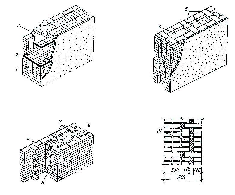 а – с трехрядными диафрагмами; б – колодцевая кладка; в – анкерная кирпично-бетонная кладка; г – с внутренним жестким утеплителем; 1 – легкий бетон или другой утеплитель; 2 – диафрагма из трех рядов кладки; 3 – растворная стяжка; 4 – колодец, заполненный утепляющим материалом; 5 – вертикальная диафрагма из тычковых кирпичей; 6 - наружная верста; 7 – анкеры из тычков кирпича; 8 – внутренняя верста; 9 – легкий бетон;
