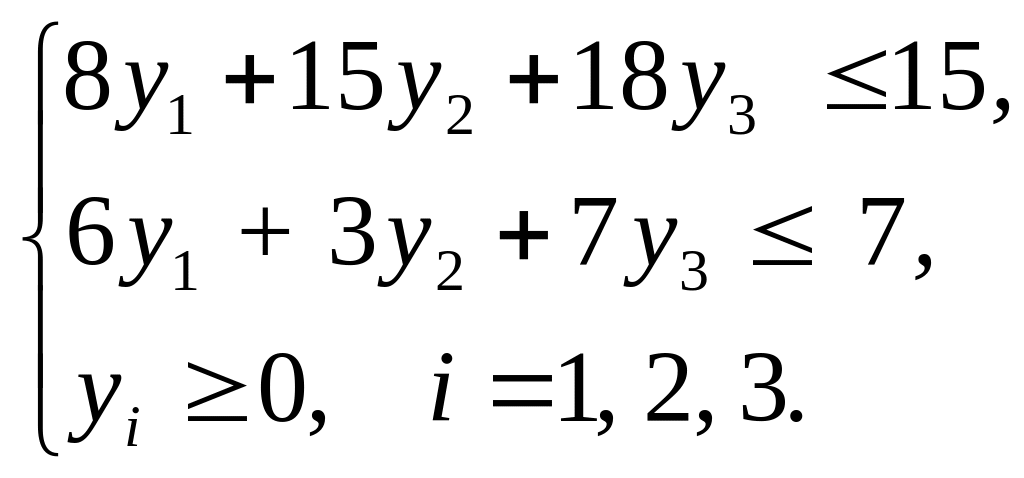 Составляется система ограничений двойственной задачи. Матрицу коэффициентов системы ограничений двойственной задачи получают транспонированием матрицы коэффициентов исходной задачи. Знаки неравенств системы ограничений двойственной задачи противоположны знакам неравенств в исходной задаче. Свободными членами неравенств системы ограничений являются коэффициенты целевой функции исходной задачи. Переменные yi (i=1, 2, …m) неотрицательны.