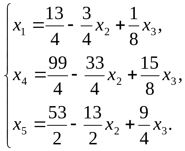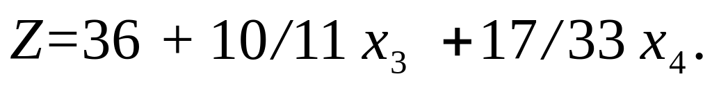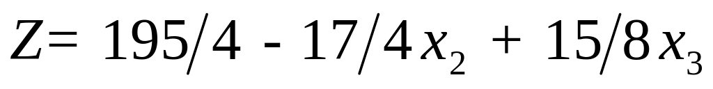 Вычислим оценочные отношения для переменной х2 в тех уравнениях, где коэффициент при х2 отрицателен: 13/3, 3, 53/13. Наименьшее из этих отношений (3) определяет разрешающее уравнение. Итак, в новый базис вместо переменной х4 вводится переменная х2. Выразим х2 и подставим полученное выражение в остальные уравнения и в целевую функцию: