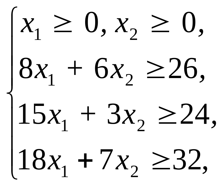 Пример 2. В магазине продается два вида удобрений для комнатных растений: «Турбо» и «Форте», расфасованных в пакеты по 100 г. В 100 г удобрения «Турбо» содержится 8% азота, 15% фосфора и 18% калия, а в 100 г удобрения «Форте» – 6% азота, 3% фосфора и 7% калия удобрений. Известно, что для сбалансированного питания растений потребуется азота 26 г, фосфора 24 г, калия 32 г. Пакет удобрения «Турбо» стоит 18 руб., а пакет удобрения «Форте» 7 рублей. Определить количество пакетов удобрений (х1 и х2), которые нужно купить, чтобы обеспечить сбалансированного питание растений и минимизировать стоимость.