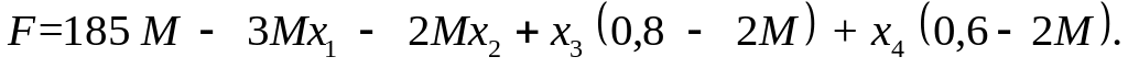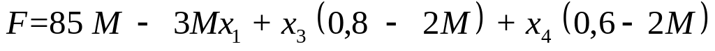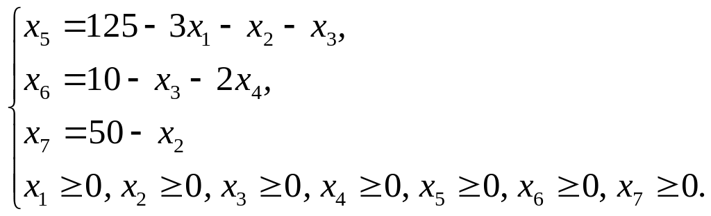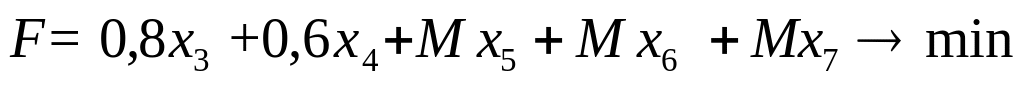 Задача дана в каноническом виде. Составим М-задачу, для этого введем в первое уравнение переменную х5, во второе – переменную х6, в третье – переменную х7, в целевую функцию добавим М х5 + М х6+ М х7.
