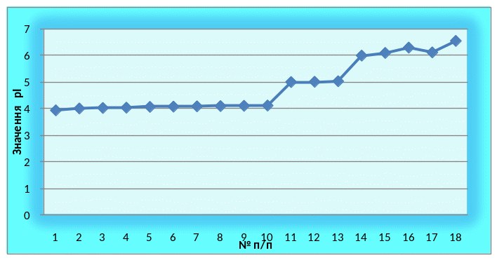 Рис. 8. Значення ізоелектричних точок (рІ) ізоферментів пероксидази проростків люпину, вирощеного на витяжках грунтів з різних районів Дніпропетровської області