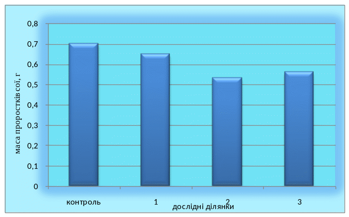 Отримані результати свідчать про те, що питома активність пероксидази коренів сої та люпину, вирощених на водних витяжках грунту з різних районів м. Дніпропетровська, збільшена відносно умовного контролю.