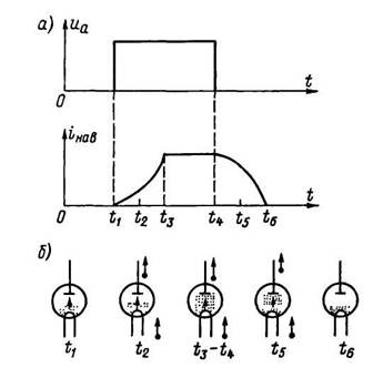 В момент t1 электроны начинают двигаться от катода (точнее, от «электронного облачка» около катода) и возникает наведенный ток. Промежуток анод — катод еще не заполнен электронами. Через некоторое время, в момент t2, значительная часть этого промежутка уже заполнена электронами. Так как они движутся в ускоряющем поле, то скорость их больше, чем в момент t1,. Благодаря этому наведенный ток становится больше и скорость его нарастания увеличивается. В момент t3 электроны достигают анода и все пространство анод — катод заполнено движущимися электронами. Наведенный ток становится максимальным. Такое положение сохраняется до конца импульса напряжения (моментt4). после чего новые электроны уже не будут двигаться от катода к аноду. А электроны, заполняющие промежуток анод — катод, продолжают по инерции двигаться к аноду. Число их уменьшается, т. е. промежуток «очищается» от электронов, и соответственно уменьшается наведенный ток (момент t5).Когда в момент t6 в промежутке анод — катод не остается электронов, наведенный ток становится равным нулю. Как видно, импульс наведенного тока растянут во времени по сравнению с импульсом напряжения и отстает от последнего, т. е. позже достигает максимума и позже спадает до нуля.