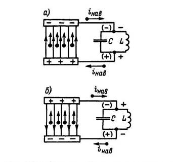 Рис. 24.5. Наведенный ток при движении электронов в поле, созданном переменным напряжением колебательного контура
