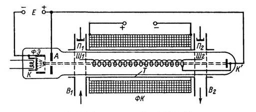 Устройство ЛБВ О-типа показано схематически на рис. 25.15. В левой части удлиненного баллона помещен электронный прожектор с подогревным катодом К, фокусирующим электродом ФЭ и анодомА. Электронный луч, созданный прожектором, проходит далее внутри замедляющей системы (например, в виде проволочной спирали), выполняющей роль внутреннего провода коаксиальной линии. Наружным проводом служит металлическая трубка Т. Спираль укреплена на специальных изоляторах (для упрощения они не показаны). Фокусирующая катушка ФК, питаемая постоянным током, служит для сжатия электронного луча по всей его длине, чтобы предотвратить увеличение поперечных размеров луча из-за взаимного отталкивания электронов. Вместо катушки для фокусировки могут быть применены также постоянные магниты. Так как магнитные фокусирующие системы громоздки, то в последнее время разработаны электростатические способы фокусировки электронного луча в ЛБВ, т. е. фокусировка электрическим полем.