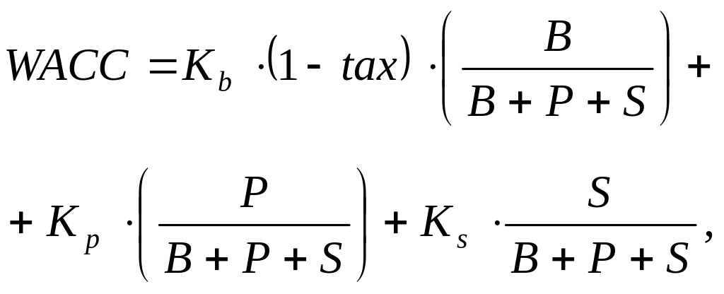 де B — облігації; P — привілейовані акції; S — прості акції; Kb — вартість капіталу від облігацій; Kp — вартість капіталу від привілейованих акцій; Ks — вартість капіталу від простих акцій; tax — ставка оподаткування.