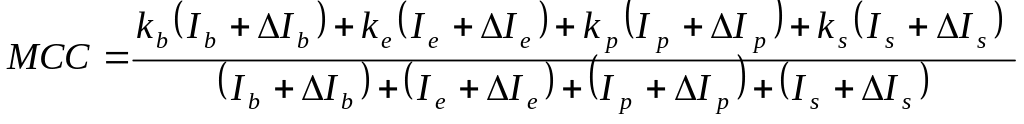 де kb, ke, kp, ks — відповідно ціна боргових коштів (b); прибутку, що залишається в розпорядженні підприємства (e); привілейованих акцій (p); простих акцій (s), коефіцієнт; Ib, Ie, Ip, Is — обсяг фінансування, одержаний з відповідних джерел, у старій структурі капіталу, грн; ∆Ib, ∆Ie, ∆Ip, ∆Is — збільшення капіталу, який залучається з відповідних джерел, грн.