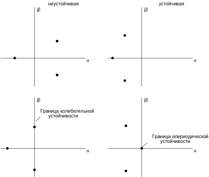Рис. 44. Примеры оценки устойчивости по расположению корней характеристического уравнения