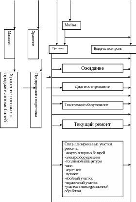 В основу организации технологического процесса положена единая функциональная схема: автомобили, пребывающие на СТОА для проведения ТО и ремонта, проходят участок уборочно-моечных работ и поступают далее на участки приёмки, диагностирования, ТО и ТР.