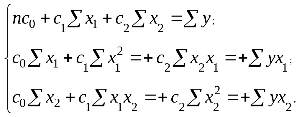 Параметры модели находят в ходе решения системы нормальных уравнений, например, методом наименьших квадратов. Для случая, когда на функцию у, характеризующую изучаемое явление, влияет изменение одновременно двух факторов x1 и х2, система уравнений имеет вид
