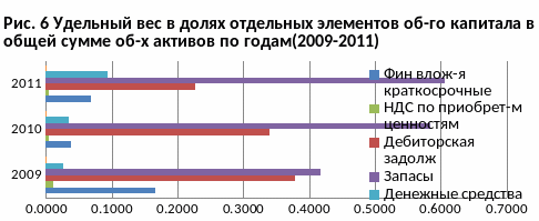 По данным таблице видно, что удельные веса оборотного и внеоборотного капитала в общих активах за период с 2009 по 2011 изменились незначительно. В относительных значениях за период с 2009 по 2011 общий объем активов также не сильно претерпел изменения: рост около 3% (293256, 1395/284069,715). На рисунке 4 видно, как снизился объем оборотного капитала: