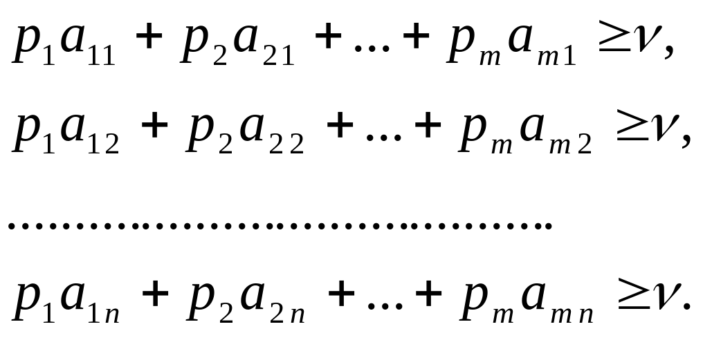Стратегия оптимальная при любом поведении противника обеспечивает выигрыш не меньше чем , отсюда условия