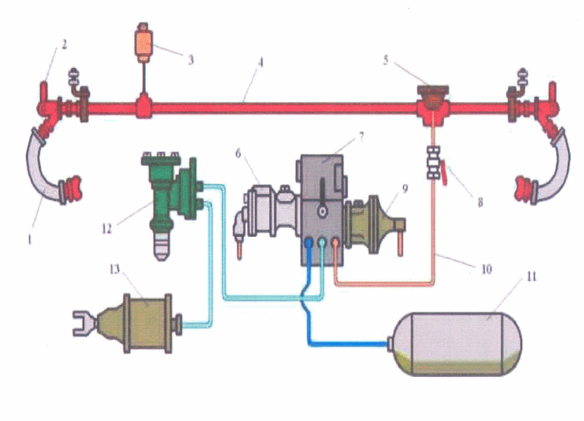 На магистральной трубе 4 диаметром 32 мм расположены концевые краны 2 № 190 и соединительные рукава 1 . Концевые краны установлены с поворотом 60® относительно горизонтальной оси. Это улучшает работу рукавов в кривых участках пути и устраняет удары головок рукавов при следовании через горочные замедлители.